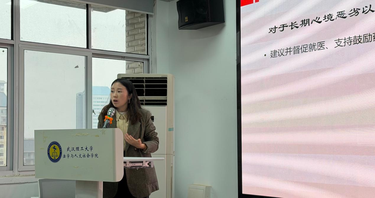 学校心理健康中心唐光蓉老师以“大学生心理问题识别与应对”为主题,分享了“如何分层分类识别并帮扶心理关怀学生”的方法。唐老师从“知、情、行、意”等四个维度介绍了常见心理问题发生的信号,从“行为、学习、人际、睡眠、情绪、自我评价、家庭关系”等七个方面介绍了常见心理问题的症状,通过实际案例介绍了“开放式提问”的谈心谈话工作方法。