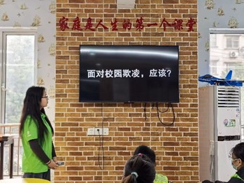 接着,志愿者通过贴近校园生活的欺凌情景模拟视频,以沉浸式画面清晰地展示欺凌发生时欺凌者、受害者、旁观者三方的互动状态,让孩子们明确认识到,学生欺凌的发生并非单一一方的过错,而是欺凌者的不当行为、旁观者的冷漠态度与受害者的自我保护缺失共同作用的结果,帮助孩子们建立起对欺凌成因的全面认知。