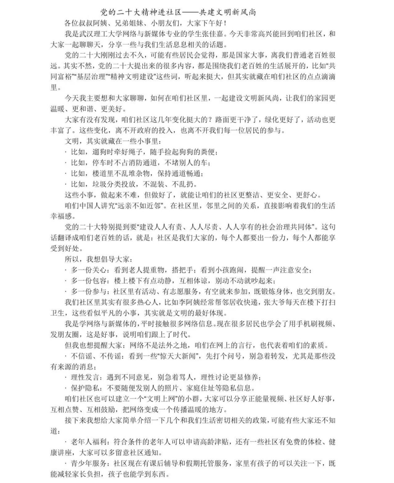 张佳嘉、关雯心还聚焦基层治理开展社区专题调研,通过多元调研方法摸清社区“三级管理”架构运行优势,发现公共活动空间不足等问题,并针对性提出空间资源重组、精准服务建设等优化策略。此外,张佳嘉走进社区开展党的二十大精神宣讲,结合生活实际解读精神内涵,讲解民生政策,让党的理论深入人心。