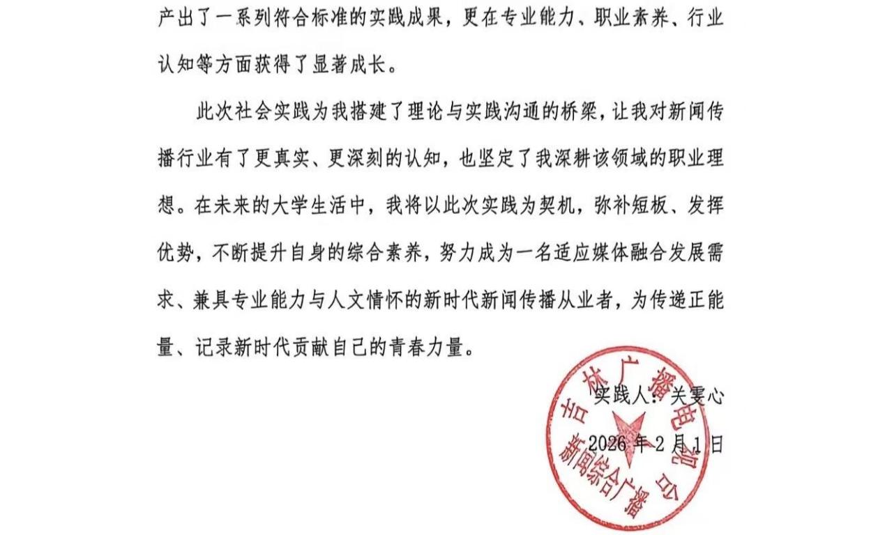 此次校外实践,是团支部落实实践育人、推动知行合一的重要举措。团员们在实践中积累了宝贵经验,提升了专业素养与综合能力,深刻体会到青年的社会责任与时代使命。下一步,新媒体2504团支部将总结实践经验、补齐能力短板,持续推动理论学习与实践探索相结合,引导团员把实践收获转化为成长动力,努力成长为适应时代需求的复合型新媒体人才,用青春力量书写奋斗篇章。