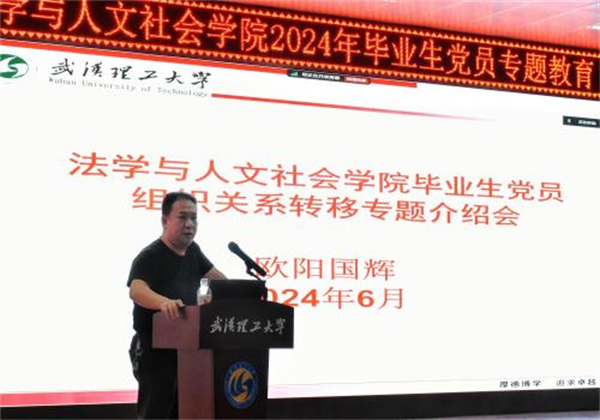 欧阳国辉老师针对学校党委组织部发布的《关于做好2024届毕业生党员教育及组织关系转接等工作的通知》作了专题介绍。他简要介绍了党组织关系转接的基本流程,对毕业生党员本校读研或工作、出国留学、组织关系需暂留学校、已签工作单位、未签工作单位等不同党组织关系转接情况作了详细讲解,对回执信、介绍信等规范、细节作了重点提醒。他谈道:毕业生党员们在党组关系转接过程中遇到任何问题要及时与组织沟通,草榴社区将尽心尽力解决同学们的问题。